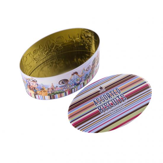 This is a large-capacity oval tin box, suitable for holiday cookies packaging.